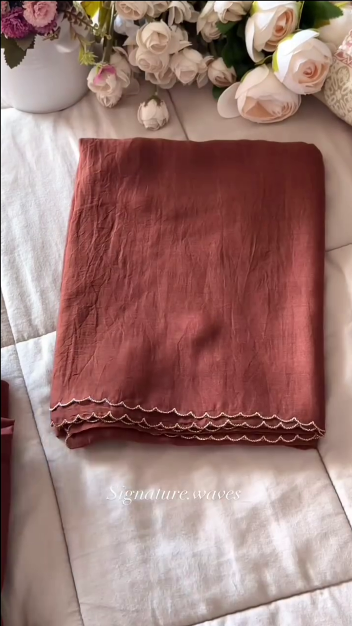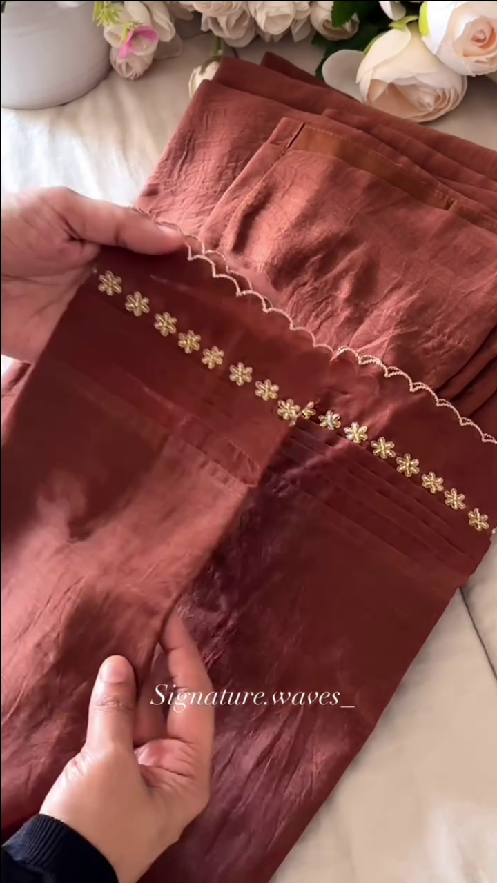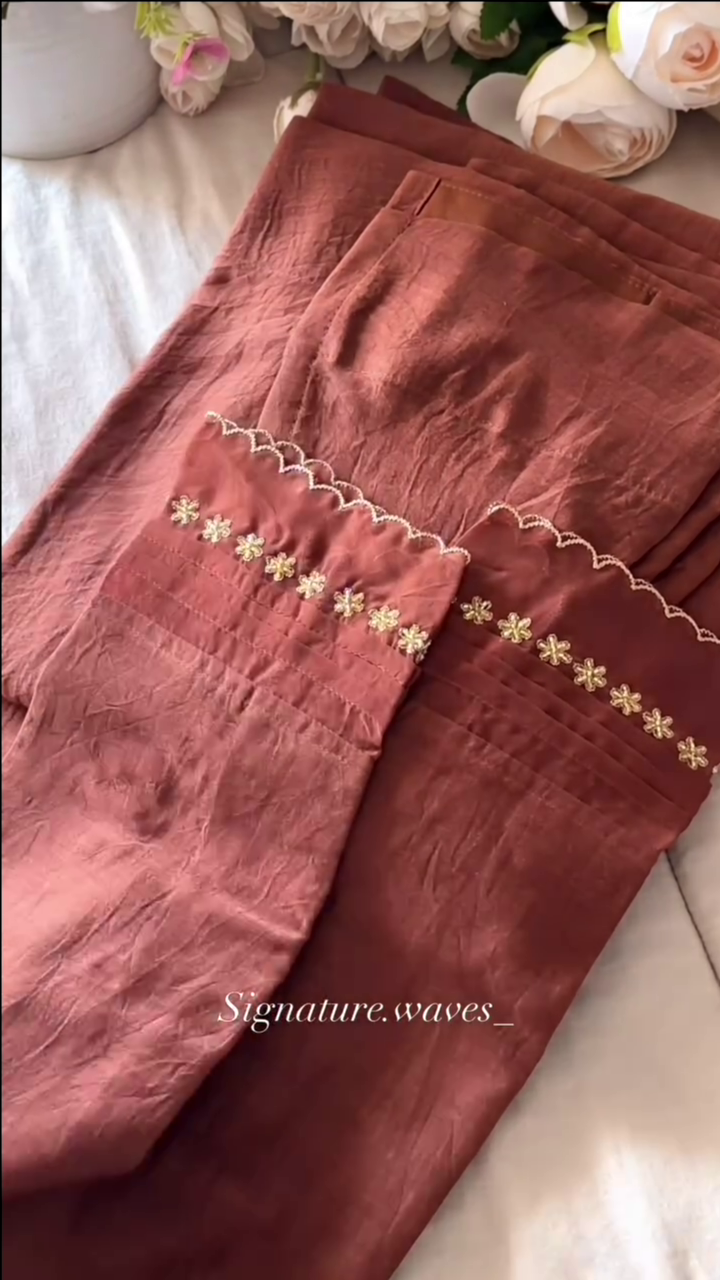 A rich brown Chanderi suit set that speaks of understated elegance.The top is adorned with intricate golden handwork on the neckline and sleeves, while the pure Chanderi dupatta, finished with delicate handwork scallops, completes the look with effortless charm.